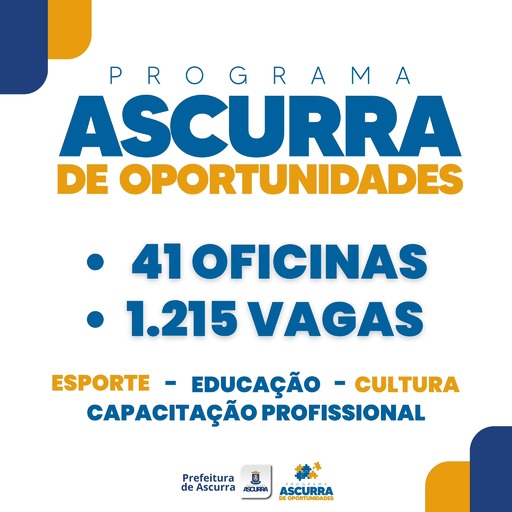 O Programa Ascurra de Oportunidades está de volta em 2024 e vem repleto de oportunidades imperdíveis! Este ano, estamos oferecendo diversas oficinas culturais, cursos educacionais, capacitação profissional e modalidades esportivas para que você possa se desenvolver e se divertir ao máximo!