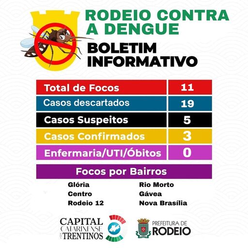 A Vigilância Sanitária e Epidemiológica da Prefeitura de Rodeio informa os números atuais da situação da dengue no município.