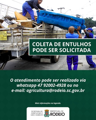 A Secretaria de Meio Ambiente e Agricultura disponibiliza ao público o serviço de “Coleta de Entulhos”, mediante agendamento prévio, que se destina ao recolhimento e descarte adequado de móveis e eletrodomésticos volumosos.