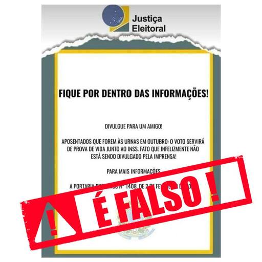 Circula nas redes um suposto aviso do Tribunal Superior Eleitoral (TSE) afirmando que “aposentados que forem às urnas: o voto servirá de prova de vida junto ao INSS, fato que infelizmente não está sendo divulgado pela imprensa”.