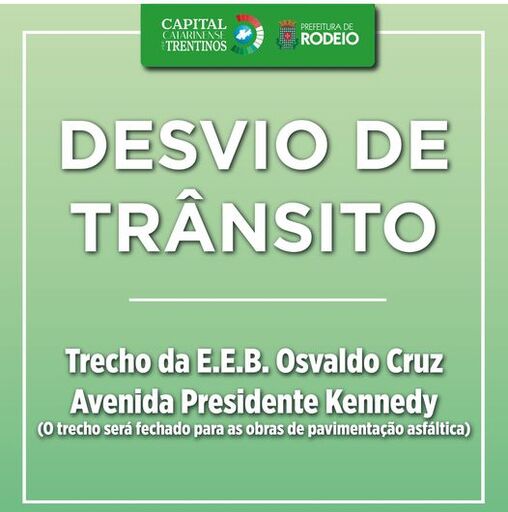 A Secretaria de Obras da Prefeitura de Rodeio vem, por meio deste, informar que o trânsito que passa pela Avenida Presidente Kennedy, trecho da EEB Osvaldo Cruz, será desviado para a Rua Barão do Rio Branco em decorrência dos trabalhos para aplicação da Pavimentação Asfáltica neste trecho da Kennedy.