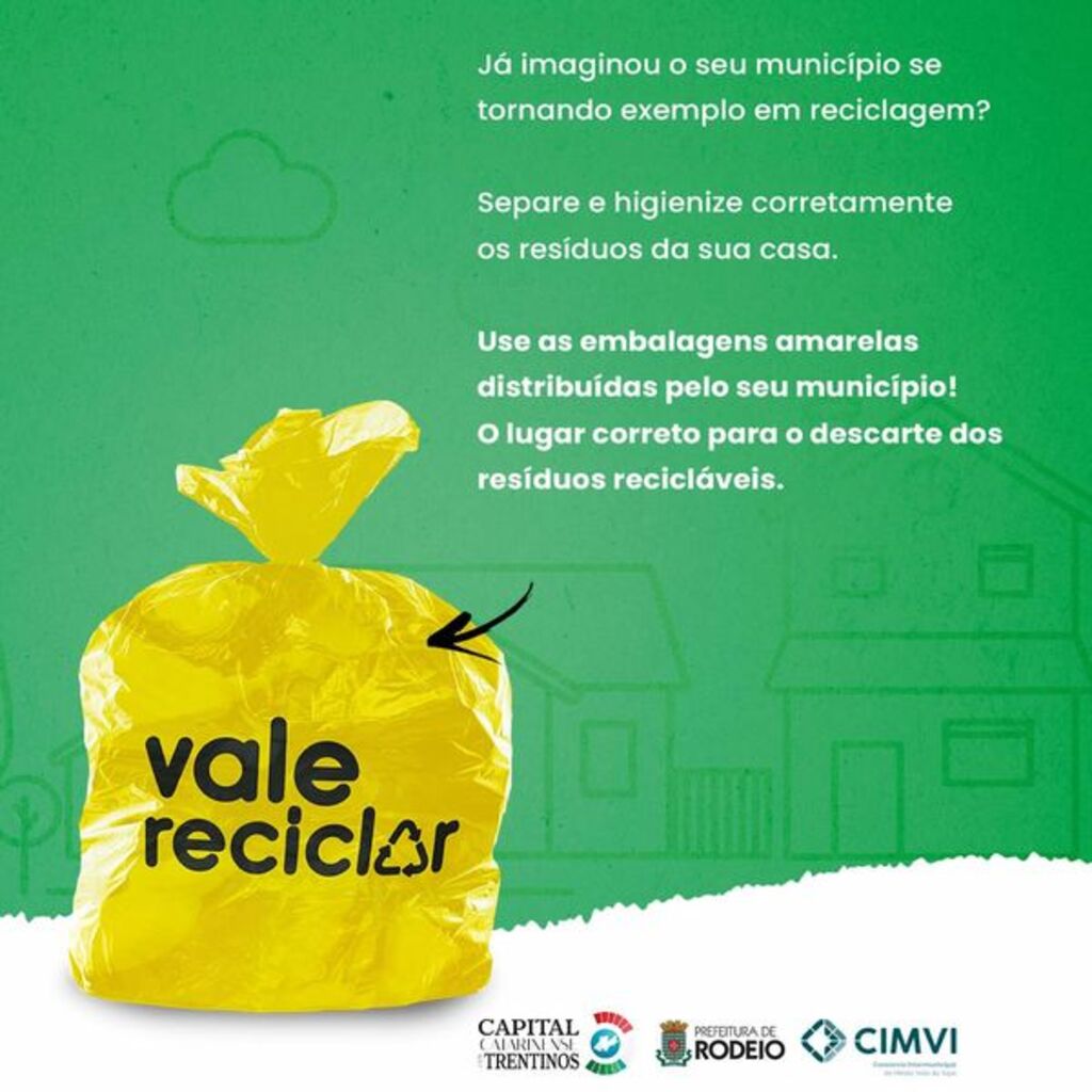 Em Rodeio, as embalagens amarelas da coleta seletiva são distribuídas no ato da coleta. O resíduo é recolhido e as novas embalagens já ficam à disposição da população.