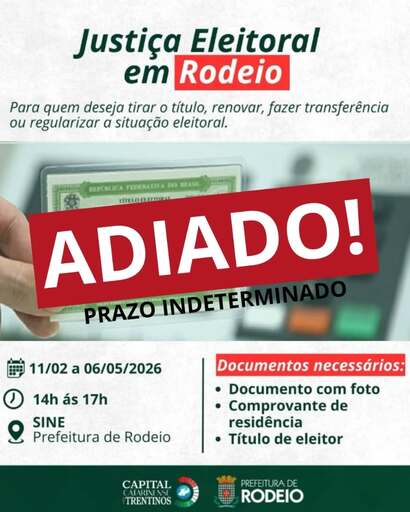 Informamos que o atendimento da Justiça Eleitoral em Rodeio foi ADIADO POR TEMPO INDETERMINADO.