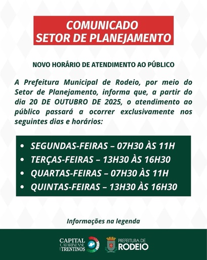 A Prefeitura Municipal de Rodeio, por meio do Setor de Planejamento, informa que, a partir do dia 20 DE OUTUBRO DE 2025, o atendimento presencial ao público passará a ocorrer exclusivamente nos seguintes dias e horários:
