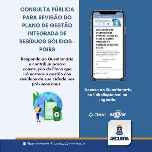 Está em andamento a primeira revisão do Plano de Gestão Integrada de Resíduos Sólidos - PGIRS de Ascurra, documento que irá nortear a gestão de resíduos do nosso município nos próximos anos, sendo de grande importância a participação da sociedade na sua construção.