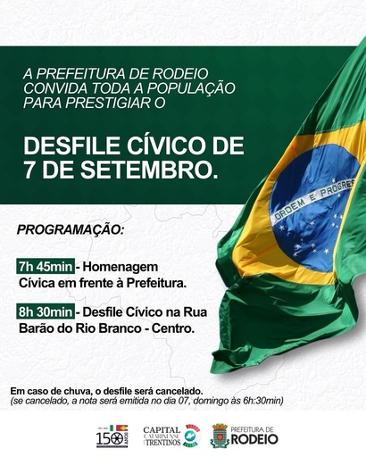 Neste 7 de setembro celebramos a Independência do Brasil, um marco histórico que simboliza liberdade, união e cidadania. A Prefeitura de Rodeio convida toda a população para prestigiar as homenagens e o desfile cívico.