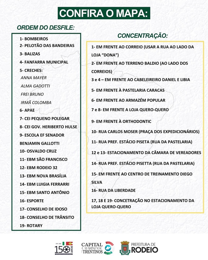 Trajeto do Desfile: Início em frente ao Correio e término no Salão Cristo Rei.