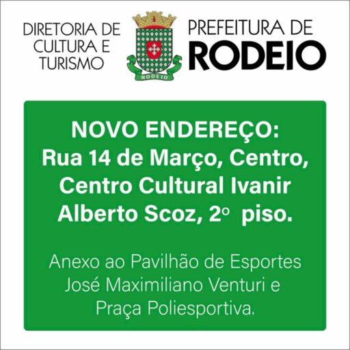 A Diretoria de Cultura e Turismo está de endereço novo! A nova sede está localizada na Rua 14 de março, centro, no Centro Cultural "Ivanir Alberto Scoz", segundo piso.