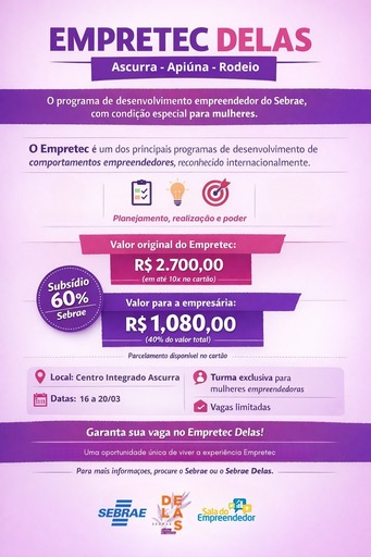 O Empretec Delas é uma imersão prática de 6 dias do Sebrae, baseada em metodologia da ONU, para desenvolver o comportamento empreendedor na prática.