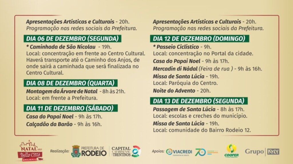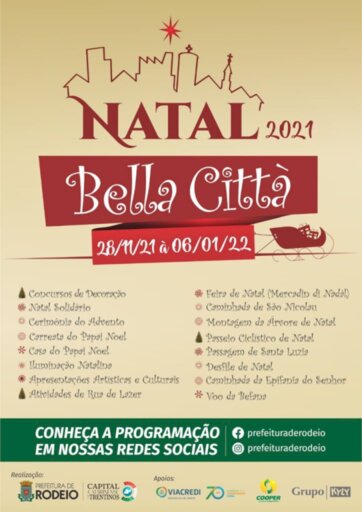 Na noite de terça-feira, (19/10) a Prefeitura de Rodeio através de sua Diretoria de Cultura apresentou para a comunidade a Programação do Natal Bella Città 2021.