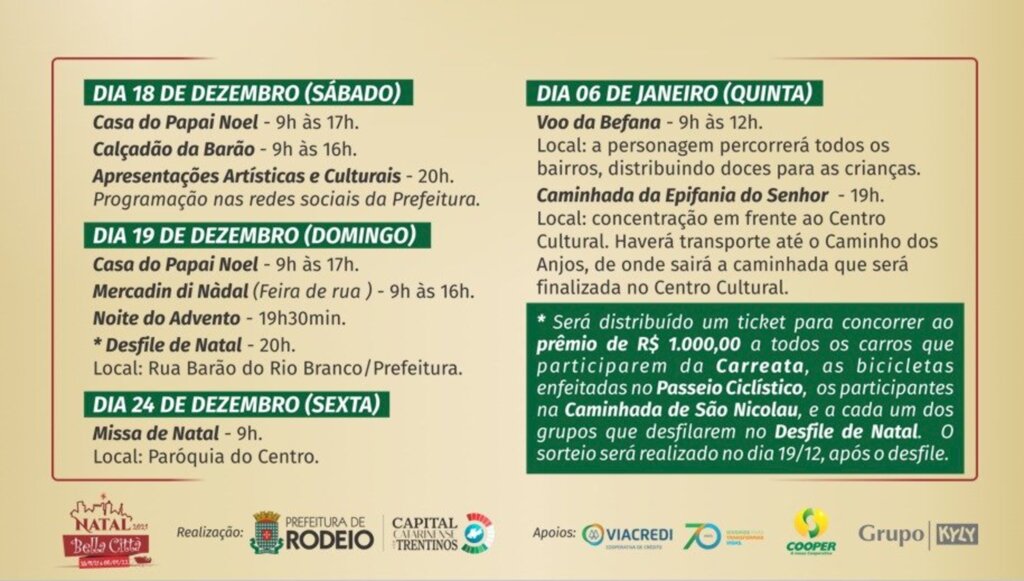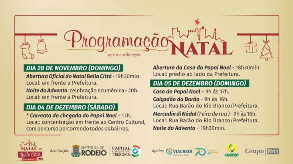 Diante deste cenário, a Prefeitura de Rodeio está assumindo para si a responsabilidade de envolver e integrar responsavelmente a população local em torno de uma programação baseada na promoção do "espírito natalino" de nascimento de um novo período.