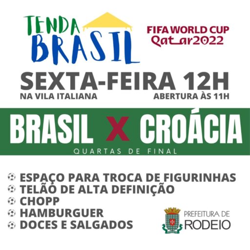 Venha torcer para o nosso Brasil em um espaço especial para toda comunidade na Tenda Brasil, uma estrutura montada na Vila Italiana que transmitirá o jogo do Brasil X Croácia pelas quartas de final da Copa, nesta sexta-feira (09/12)!