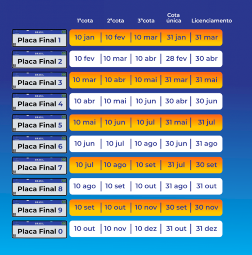 Em cota única, o imposto deve ser quitado até o final de cada mês - o prazo para placas com final 1 vai até 31 de janeiro.