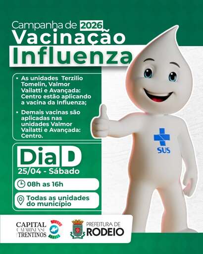 A Prefeitura de Rodeio segue com a campanha de vacinação contra a Influenza, protegendo a população e reforçando os cuidados com a saúde!