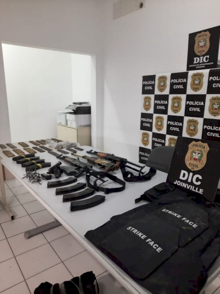 De acordo com o delegado, o grupo estava em um galpão, em Araquari, onde foram apreendidas diversas armas como fuzis e AK 47. Também foram encontrados explosivos como coquetel molotov, munições, coletes a prova de bala - inclusive com proteção a tiros de fuzil, e seis carros de luxo blindados. Todos estes itens vieram de outros estados para Santa Catarina.