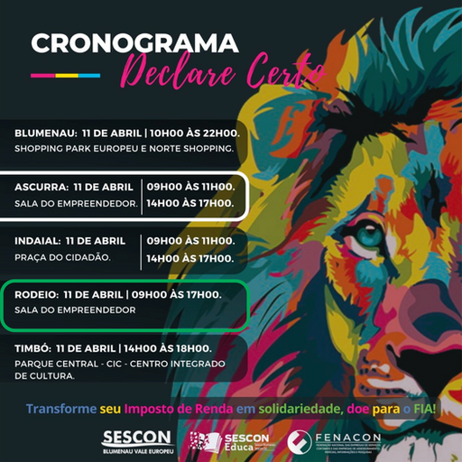 Amanhã, será realizada em Rodeio o “Declare Certo – Tire Suas Dúvidas com um Profissional Contábil”. A atividade será realizada na terça-feira, dia 11 de abril, das 9hàs 17h, na Sala do Empreendedor.