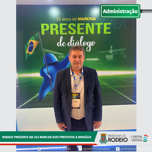 O Prefeito de Rodeio Valcir Ferrari participou da XXIV Marcha dos Prefeitos a Brasília em Defesa dos Municípios. O evento, realizado pela Confederação Nacional dos Municípios (CNM) em parceria com as entidades estaduais e regionais, a Marcha contou com mais de 10 mil inscritos. Neste ano com o tema “Pacto federativo, um olhar para o futuro, o evento reforça o pedido por diálogo com governos federal e estadual para a solução de problemas pertinentes aos municípios.