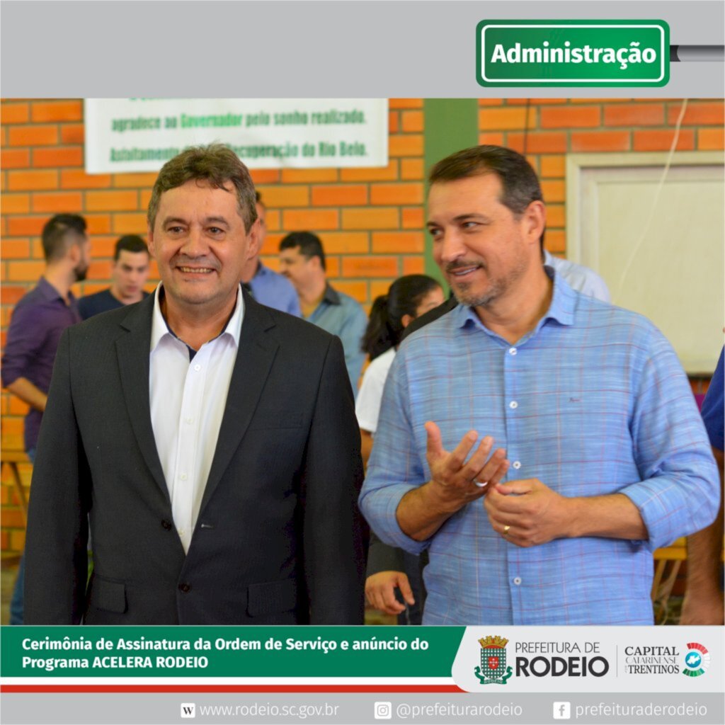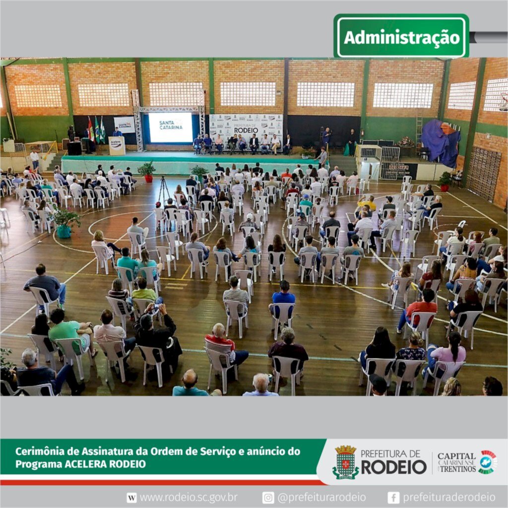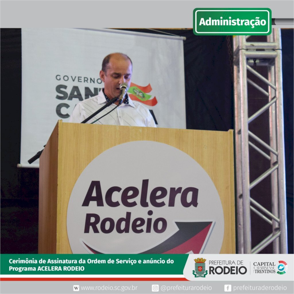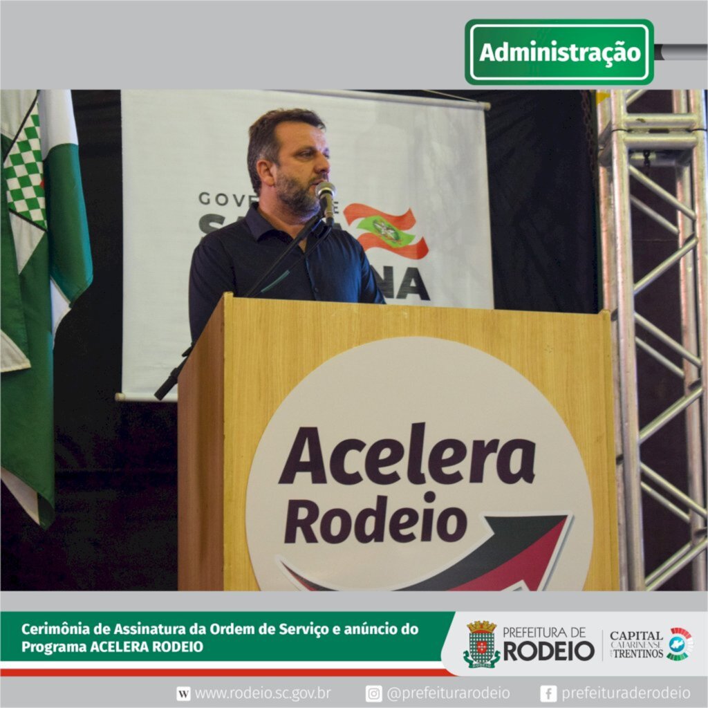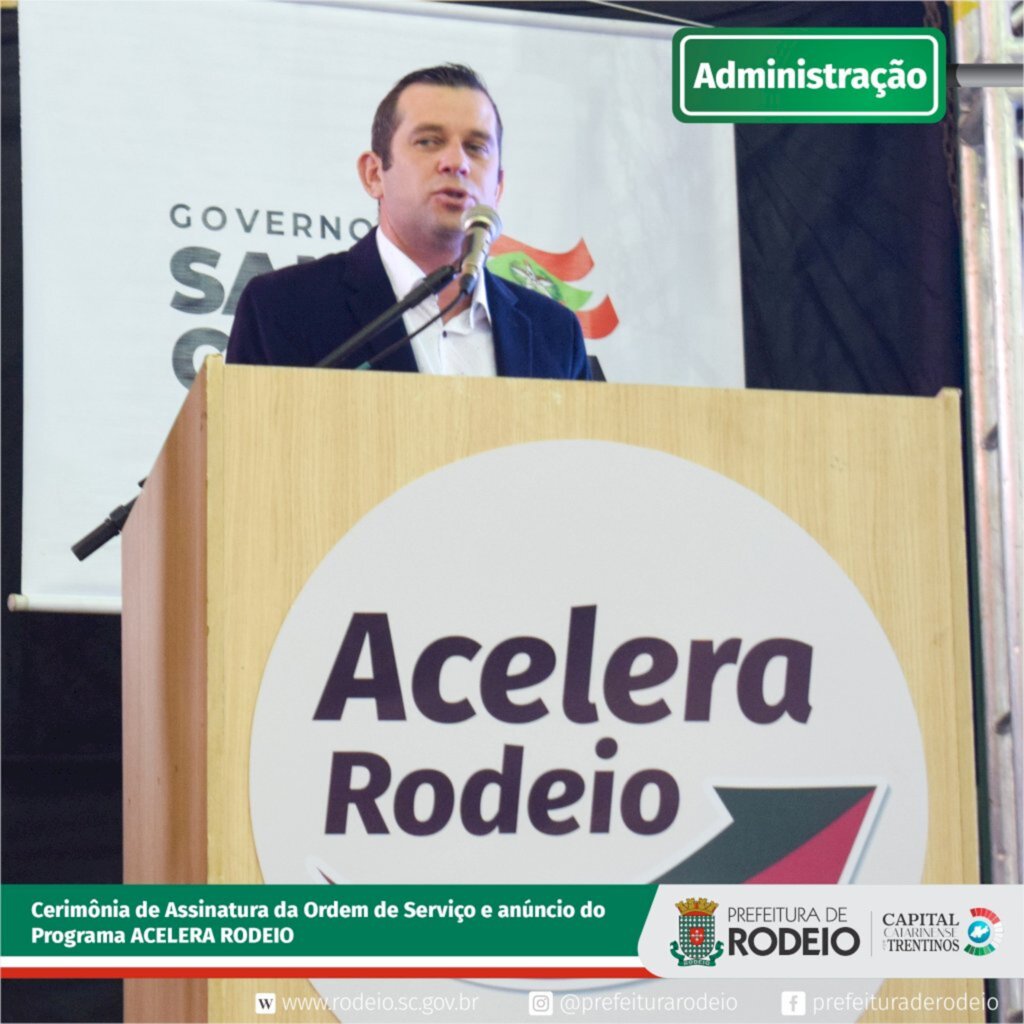 Com a presença do Governador do Estado de Santa Catarina Carlos Moises da Silva para a assinatura das ordens de serviços para o início das obras de asfaltamento da SC 110 (trecho do Bairro Rodeio 32 - Madêmer), Recuperação da Pavimentação Asfáltica da Rua Rio Belo e Pavimentação do trecho da Rua Abissínia, a Prefeitura de Rodeio, através do Prefeito Valcir Ferrari anunciou o início do Programa Acelera Rodeio, um pacote de obras que serão realizadas nos quatro cantos da cidade.