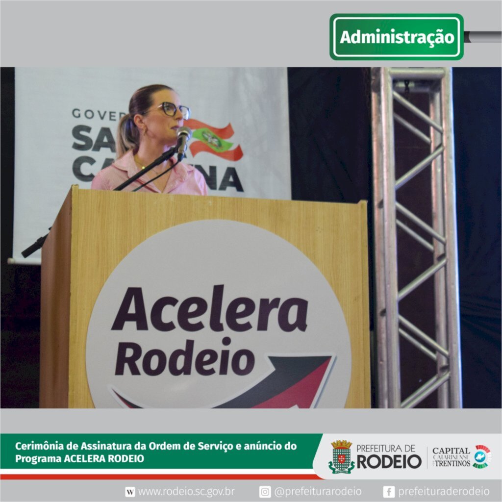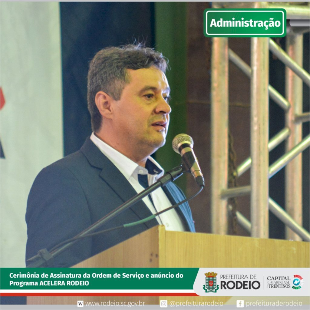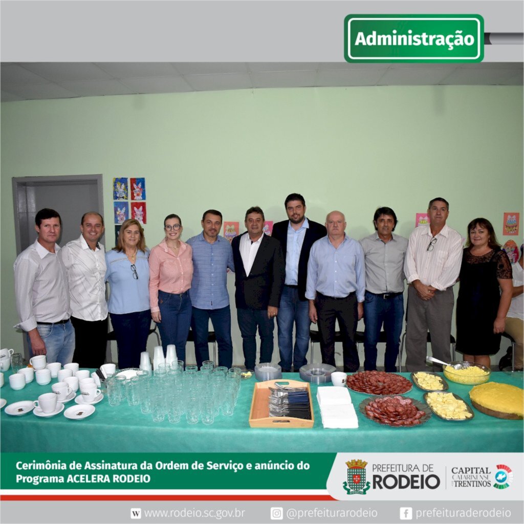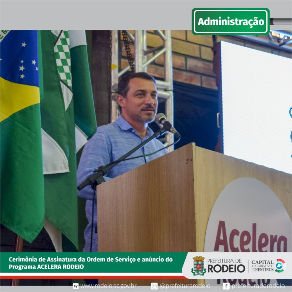Com a presença do Governador do Estado de Santa Catarina Carlos Moises da Silva para a assinatura das ordens de serviços para o início das obras de asfaltamento da SC 110 (trecho do Bairro Rodeio 32 - Madêmer), Recuperação da Pavimentação Asfáltica da Rua Rio Belo e Pavimentação do trecho da Rua Abissínia, a Prefeitura de Rodeio, através do Prefeito Valcir Ferrari anunciou o início do Programa Acelera Rodeio, um pacote de obras que serão realizadas nos quatro cantos da cidade.