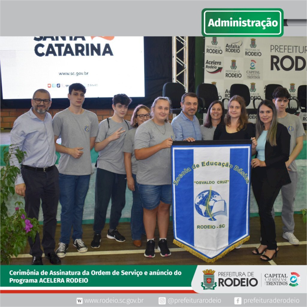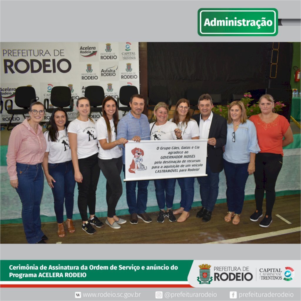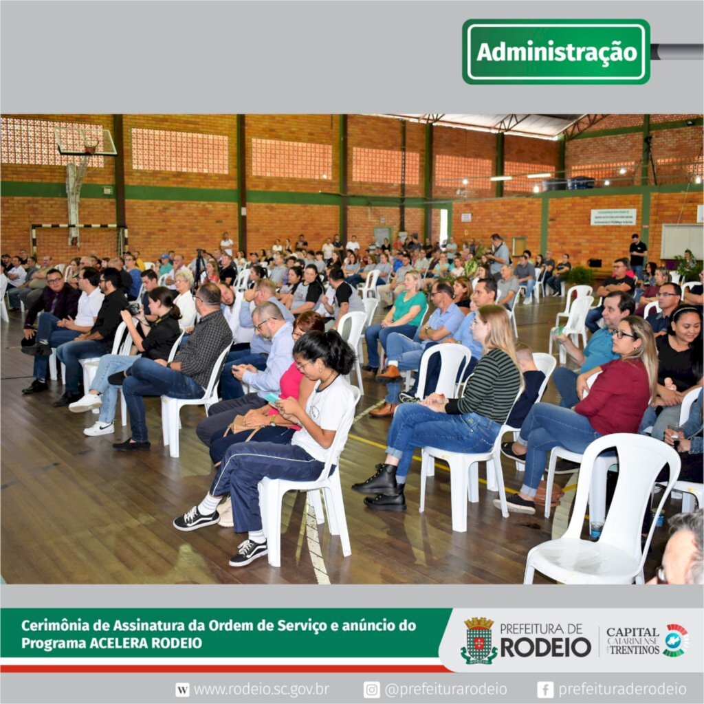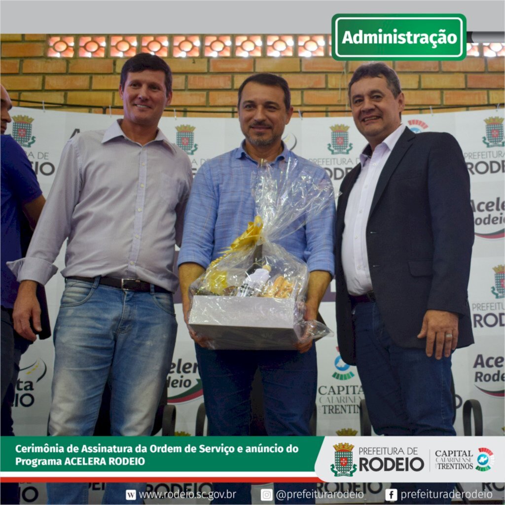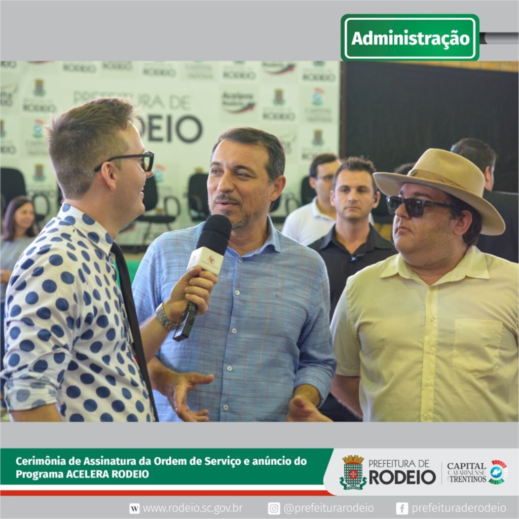 Com a presença do Governador do Estado de Santa Catarina Carlos Moises da Silva para a assinatura das ordens de serviços para o início das obras de asfaltamento da SC 110 (trecho do Bairro Rodeio 32 - Madêmer), Recuperação da Pavimentação Asfáltica da Rua Rio Belo e Pavimentação do trecho da Rua Abissínia, a Prefeitura de Rodeio, através do Prefeito Valcir Ferrari anunciou o início do Programa Acelera Rodeio, um pacote de obras que serão realizadas nos quatro cantos da cidade.